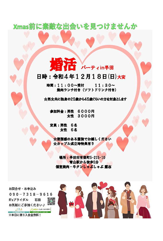 婚活パーティー開催します 2022年10月28日 婚活パーティ ありがとうございます^_^R’sブライダルの石田です。 この度は、Xmas前に素敵な出会いを見つけませんか?ということで、婚活パーティー開催する事になりました!!! 感染症予防対策として、入場時参加者の方の事前検温、アルコール消毒。体調不良の確認、マスク着用。会場内のテーブル等のアルコール除菌の徹底。十分な換気をさせていただきます。 ご予約お待ちしております。